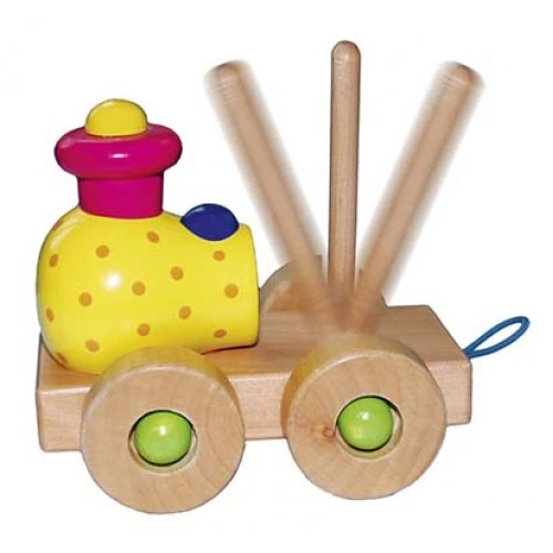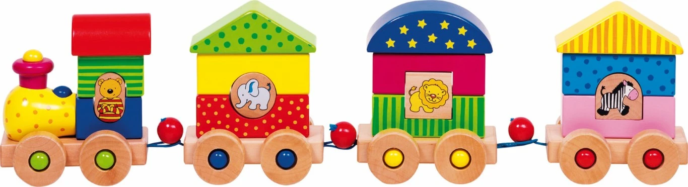 Houten trein met 3 wagonnetjes Voorzien van 16 bouwblokken en kantelmechanisme in de locomotief. Lengte 50 cm.