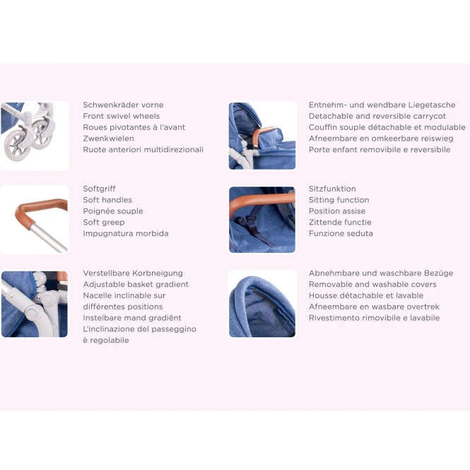 Wil je de draagmand als reiswieg gebruiken is daarvoor zelfs een licht matrasje voorzien. Door de in hoogte verstelbare duwbeugel en de zwenkwieltjes voor is de poppenwagen ook heel comfortabel voor de poppenmama – of papa.