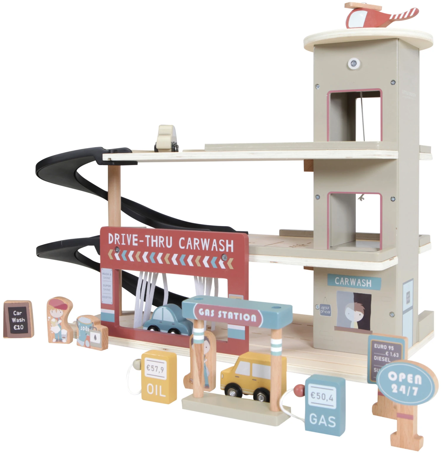 Stop bij de garage om benzine te tanken, je auto te parkeren of laat ‘m schoonmaken in de wasstraat. De uitbreiding bevat een garage met carwash, auto’s, helikopter, benzinestation, pompen, borden en medewerkers. De houten garage is één van de vele speelsets die gekoppeld kan worden aan de treinset XXL van Little Dutch. Op de garage vind je een helikopterplatform en de houten figuren zijn aan beide kanten voorzien van een gedetailleerde illustratie. Je maakt de garage helemaal af met de treinset XXL en de uitbreidingssets voor uren speelplezier.