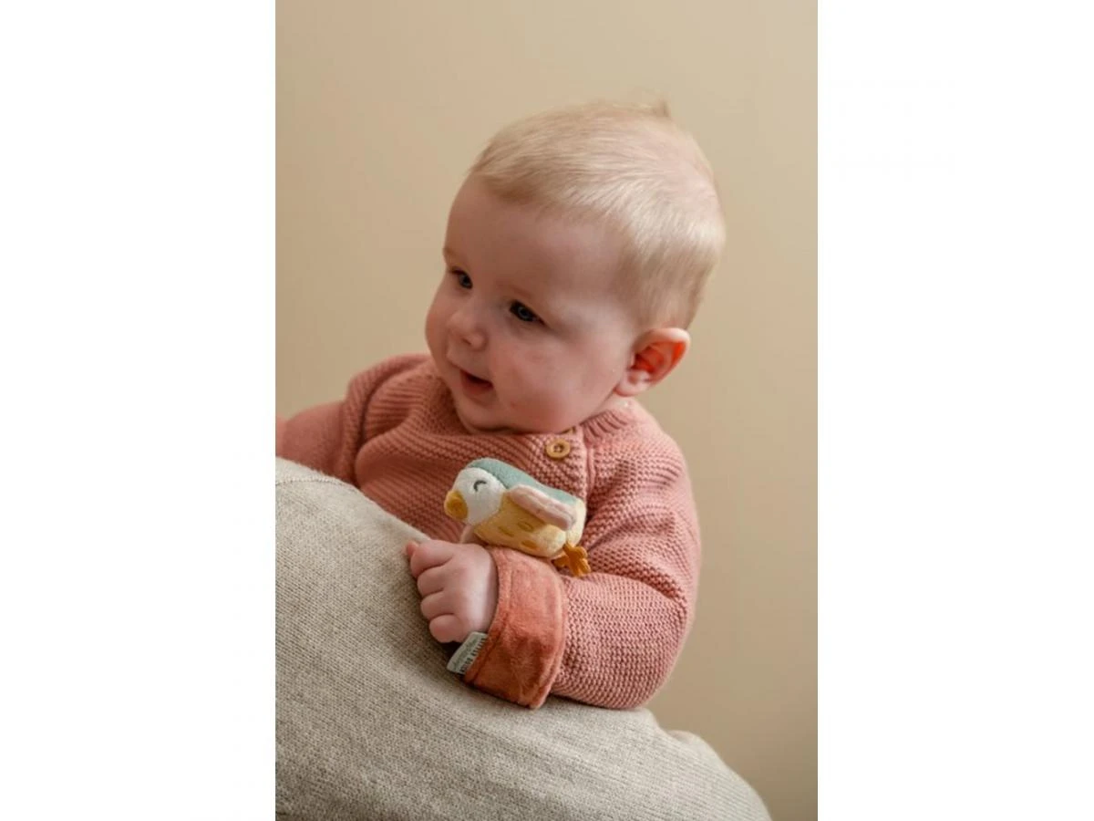 Zwaai met je handen en laat je verrassen! Wat zal je baby enthousiast worden van deze armbandrammelaar. Doe hem om de pols van je kleintje en laat het ratelende plezier maar beginnen. Het knuffelige vogeltje bovenop de armband is klaar om te bewegen! Maar er is meer te ontdekken. De knisperende vleugeltjes, labels en het kleine koordje stimuleren je kindje om te voelen en te grijpen. Geweldig vermaak voor een blije baby.