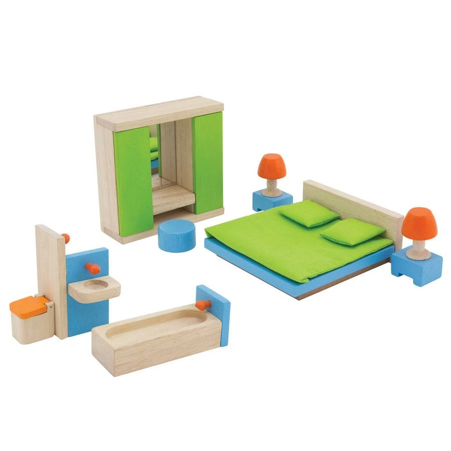 Complete slaapkamer-inrichting en badkamer voor poppenhuis. Geschikt voor alle huizen onder de categorie Poppenhuizen op deze site.