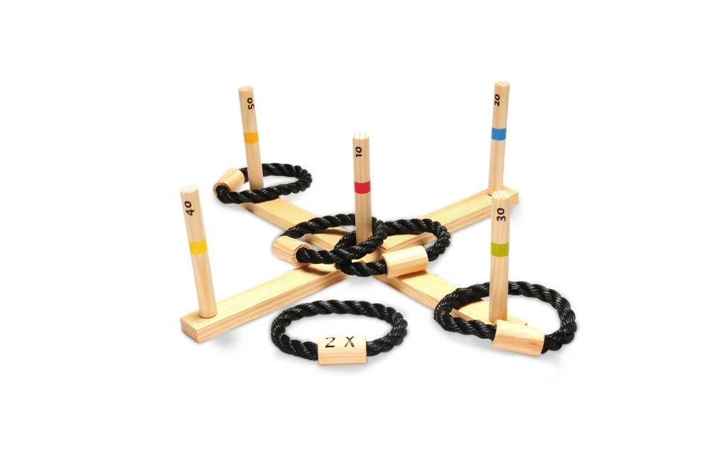 Ringgooien is een heerlijk traditioneel spel bestaande uit 1 kruis inclusief 5 pinnen en 5 werp ringen. Gemaakt van rubberthout. Het spel wordt geleverd in een colourbox, inclusief meertalige spelregels. Gewicht: 1,2 kgÂ
