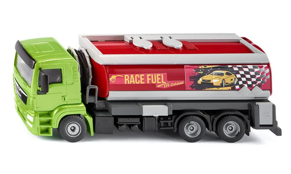 De naald van de brandstofmeter gaat bijna helemaal naar nul. Tijd om de SIKU supersportwagen bij te tanken. De nieuwe MAN TGM met tankopbouw van Esterer brengt de brandstof naar het benzinestation. Het hoogste octaangetal voor de Bugatti, Lamborghini en Co. Met behulp van de opgerolde slang achter de chauffeurscabine zijn ook de verder gelegen tankaansluitingen te bereiken. De tank kan via de kleppen op het bovenste deel worden gevuld. De technische delen van de installatie zijn via de vele kleppen op het voertuig te bereiken. De kunststoftank is veilig op het stevige drie-assige chassis van zink en de metalen cabine opgebouwd. De MAN met tankwagenopbouw is de perfecte aanvulling voor de SIKUWORLD sets Stad (5501) en de Werkplaats (5507) of voor gebruik in de steengroeve als mobiele brandstofpomp voor de Liebherr T264 dumper (1807) en de Liebherr R9800 mini-graafmachine (1798).